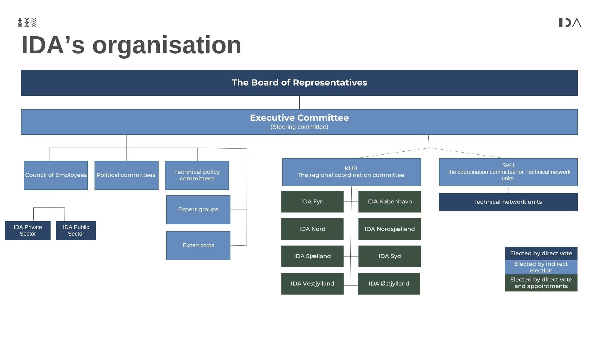 The board of representatives, the executive committee and the president will collaborate in the following years on initiatives within three main areas: IDA as a trade union, interest organisation and community.
